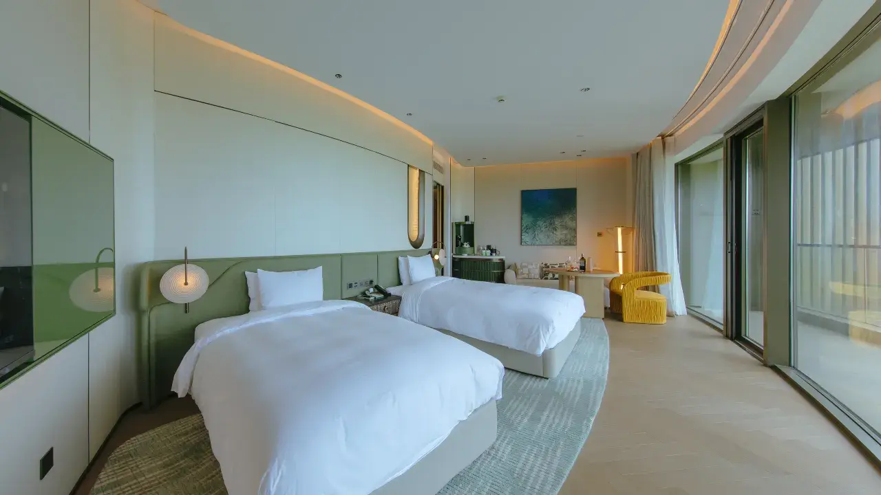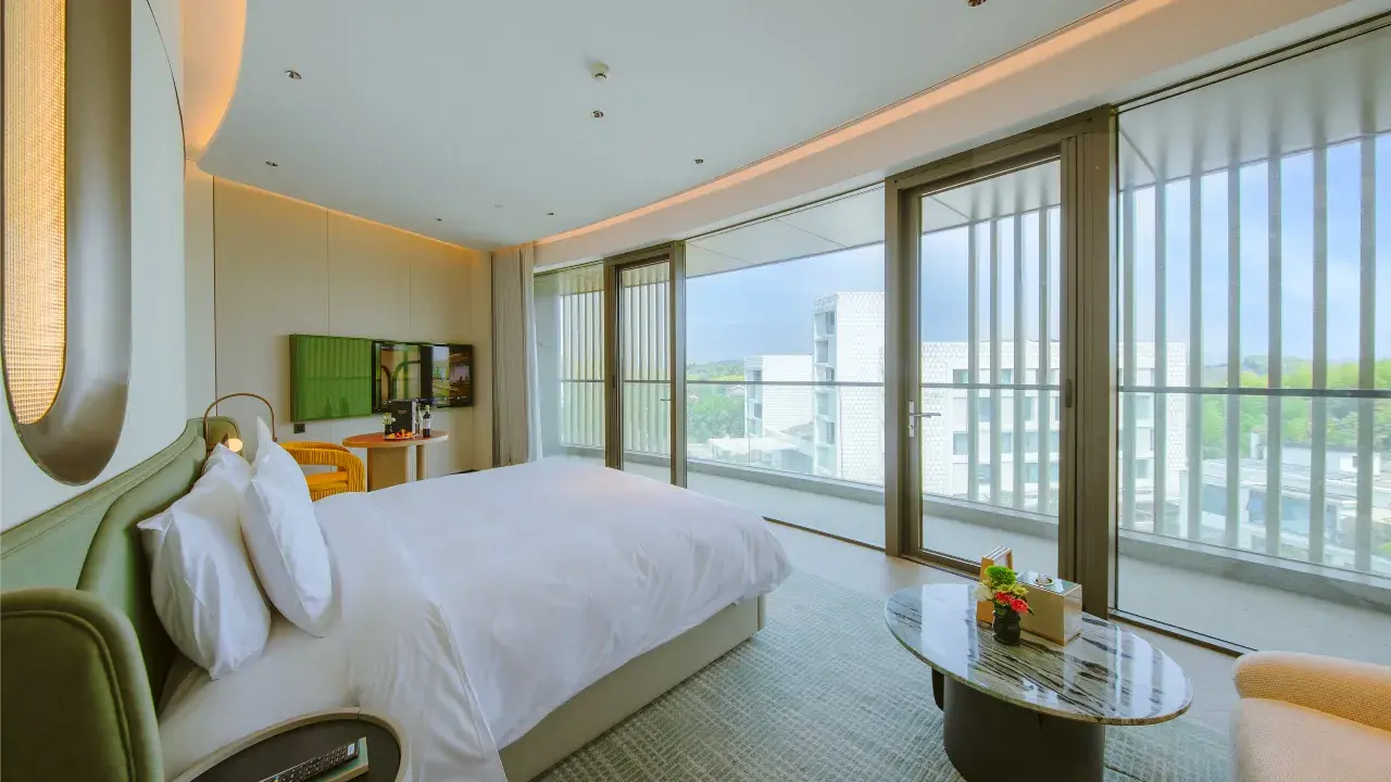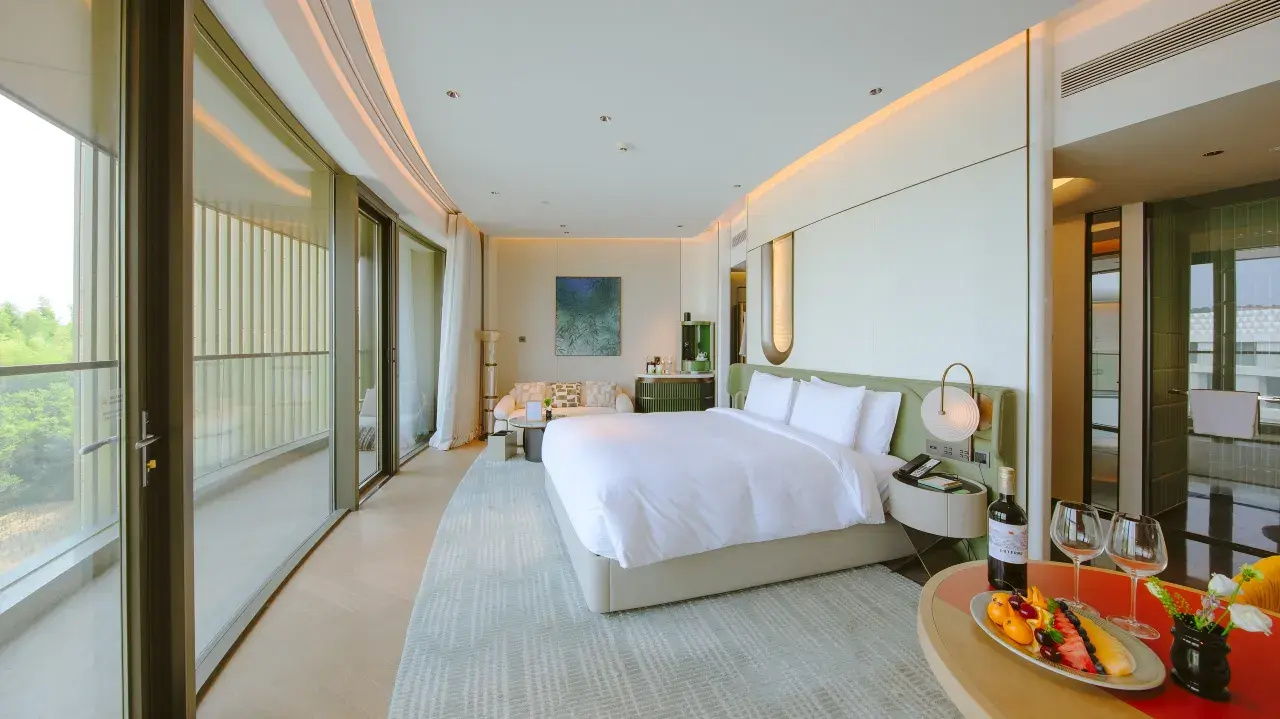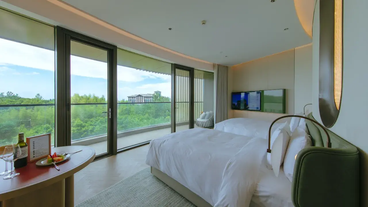 在酒店管家的引导下,寻觅各自的房间,或许「希音」「星籁」「鸣环」……诸如此类的客房名称里,总有一段旋律能入旅人之意,进而入梦。考虑客需、更要追求精致和服务,曲禅里仅打造了113间景观客房,面积55㎡起,内部为简约中式风设计,符合中国人的视觉舒适体验,仰观竹海星汉或俯瞰重林叠水,细节及居停体验感满分!