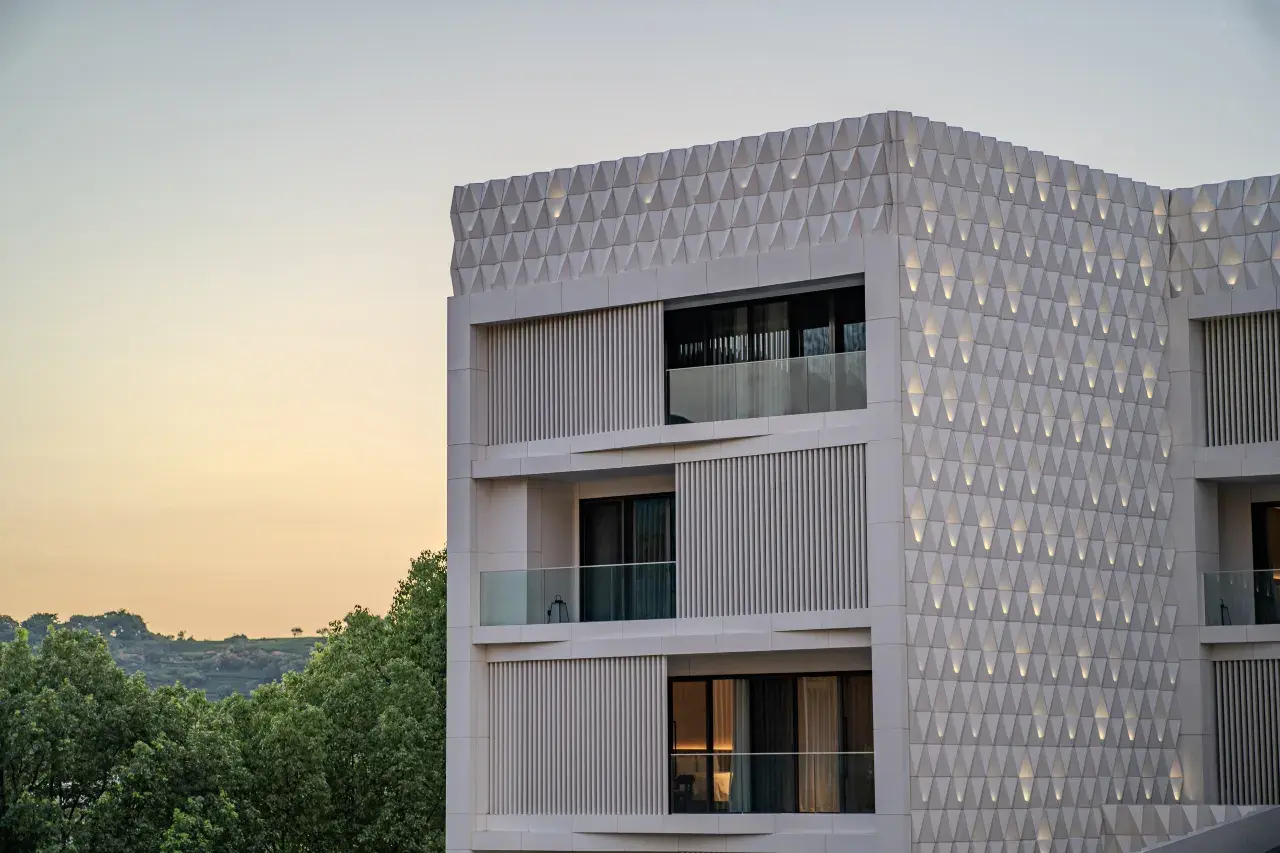 背倚溧阳南山千重竹海,风来疏竹、山水清音的质感,凝结为酒店拔地而起的竹节圆庭楼宇,与之相对的是棱角分明而墙面凹凸有致的方庭,为本就柔和的视觉空间,融山峦流线,添了几分硬朗与周正,一张一弛、圆融深刻,在这里,看到了竹的温润,在这里,也看到了天圆地方的玄远。