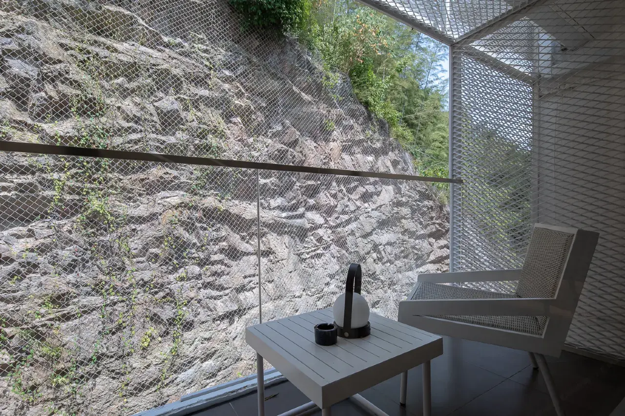 整个酒店的建筑都借助昔日岩壁的地势打造,没有过多复杂的设计,素雅的色彩搭配镂空的钢艺结构,诠释出温柔的洗练感,这份刚柔并济在这里毫无违和。