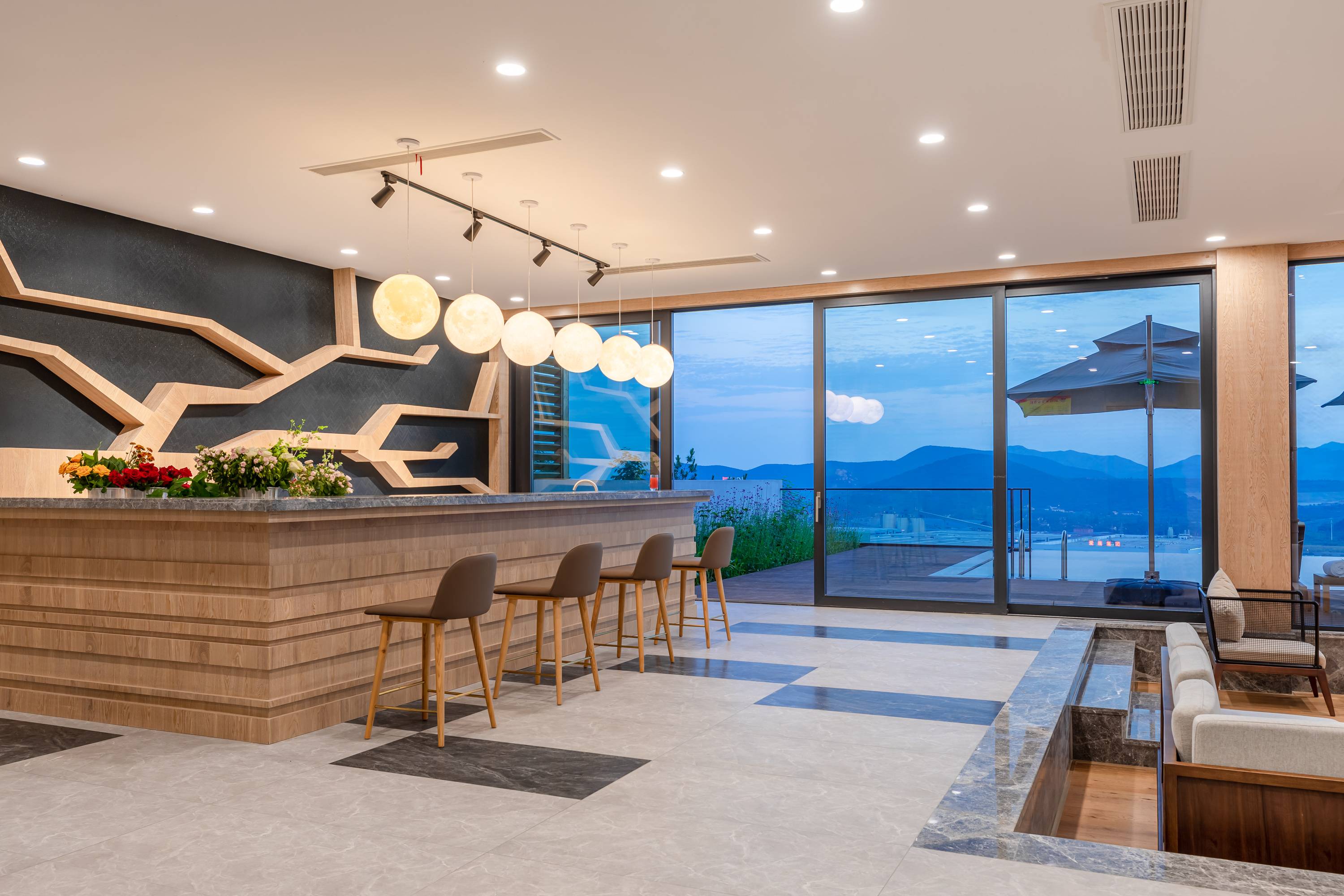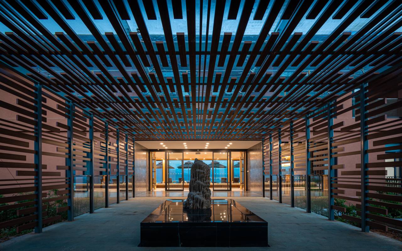 主楼占据酒店至高处,坐拥至美视野及景观,酒店大堂也位于此。穿过时光隧道般的门厅,下沉式的大堂吧映入眼帘。