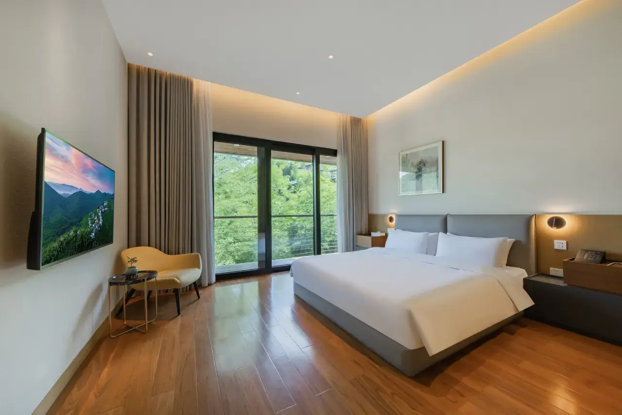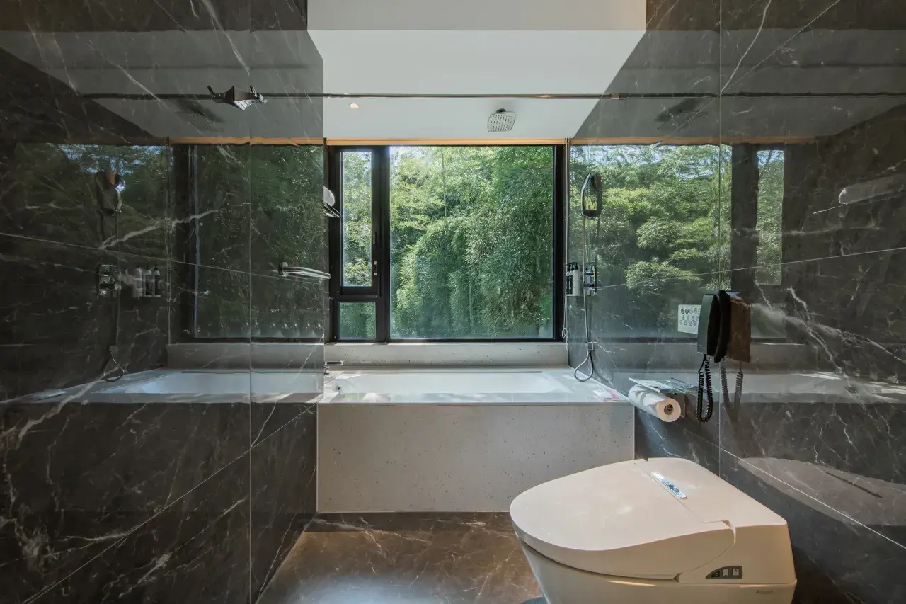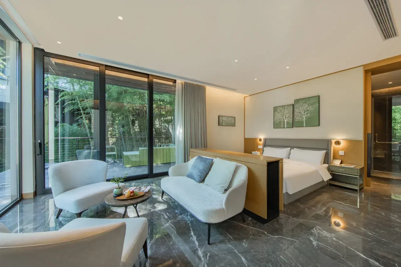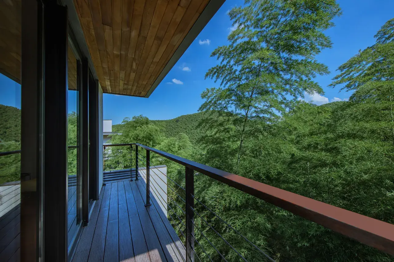 度假村的整个墙体都被设计成落地玻璃,尽可能地将室外的美景引入室内;超大的室外露台设计,让人与自然充分融合;隐于竹林的私享空间充满了诗意美学。