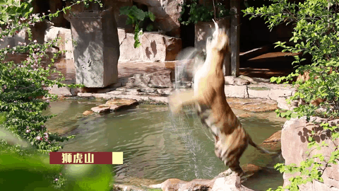 假山与绿植,中间还有一汪湖水,只见老虎时而休闲地在湖边散步,时而跳进湖里“泡澡”...别提有多惬意了~