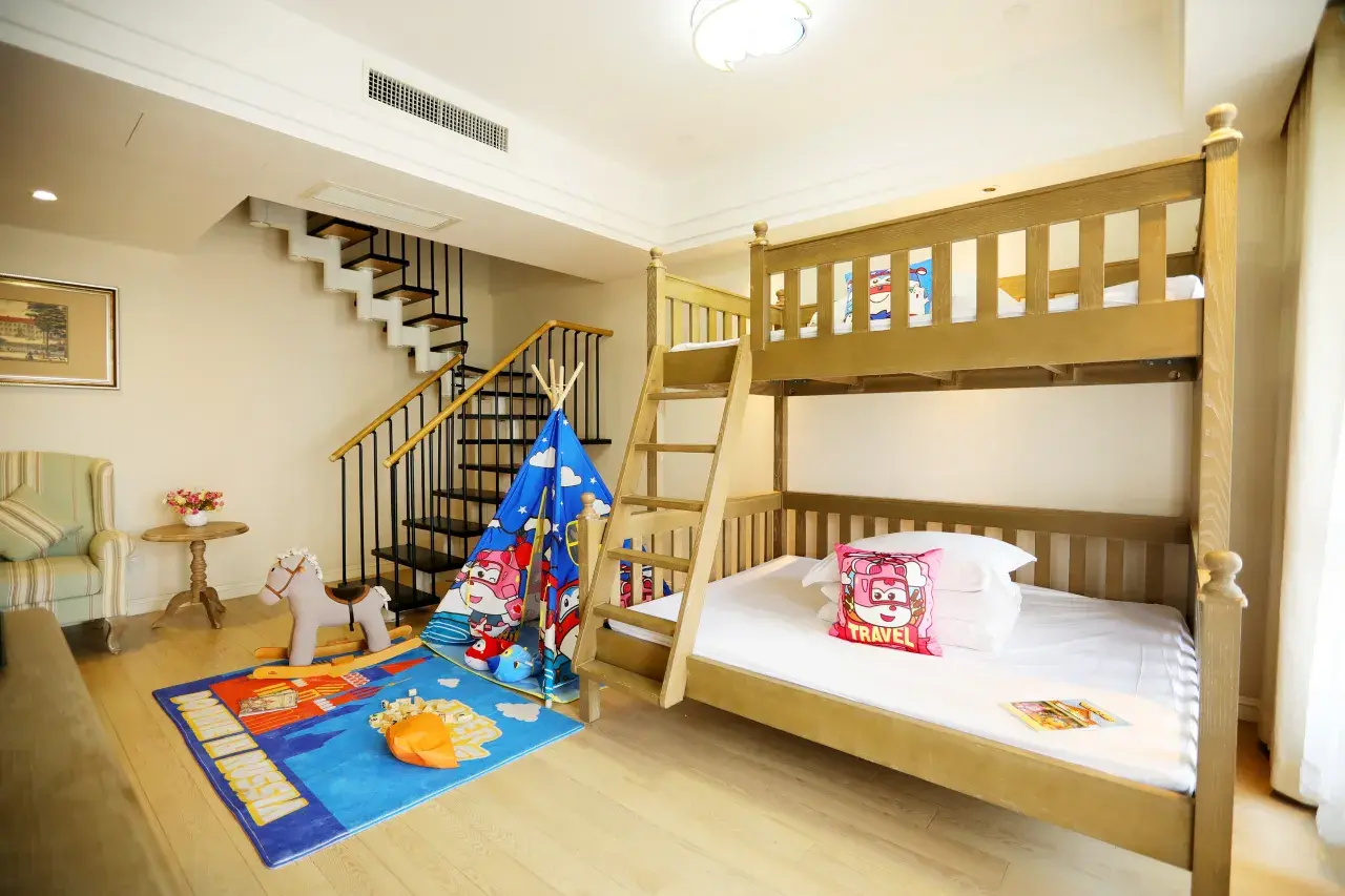 ▲亲子房(100㎡,1张1.8米大床+1张上下铺(上铺1.2米+下铺1.5米)或2张1.8米大床+1张1米单人床)