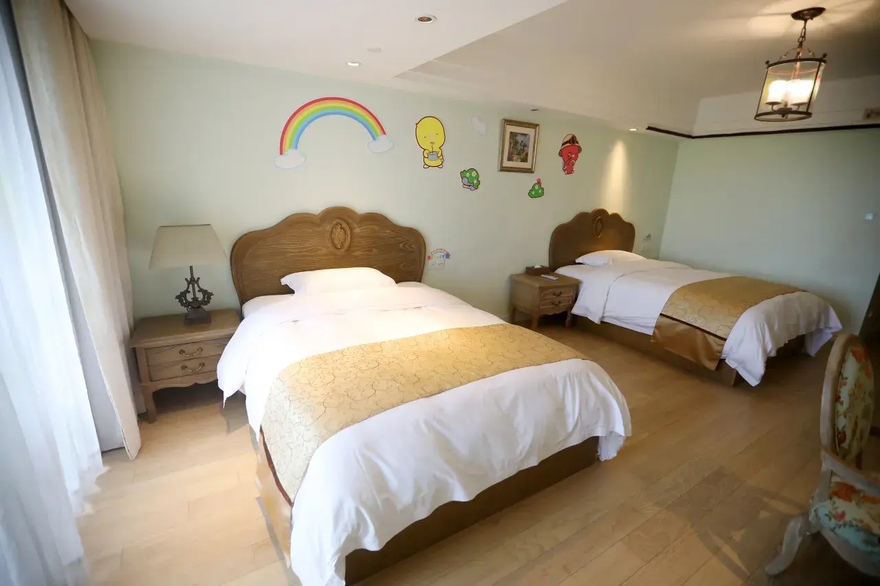 2、房型:100m²,床型:家庭房:1.8米大床+1张1.5米双人床,亲子套房:1.8米大床+1张上下铺(上铺1.2米+下铺1.5米)或2张1.8米大床+1张1.1米单人床