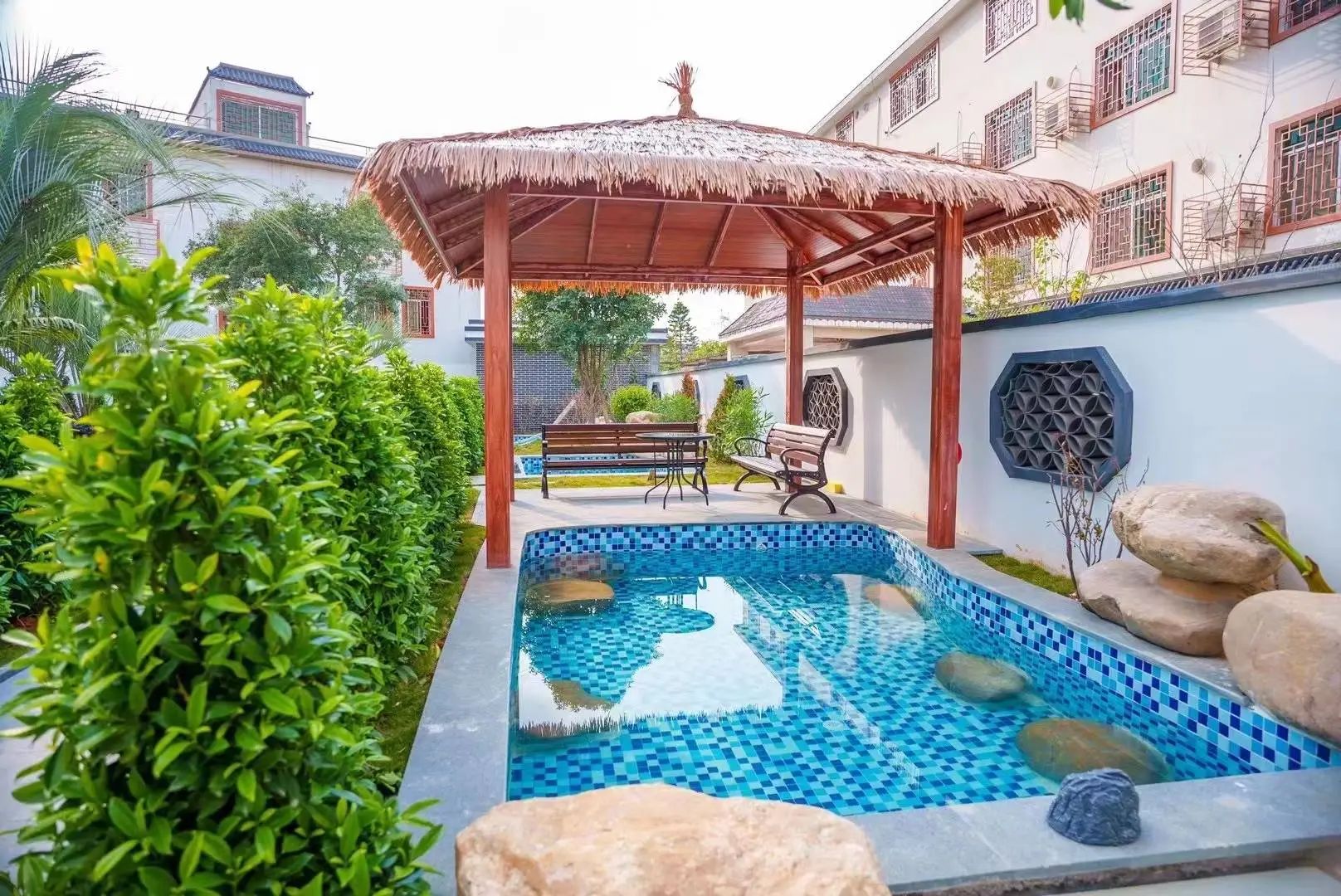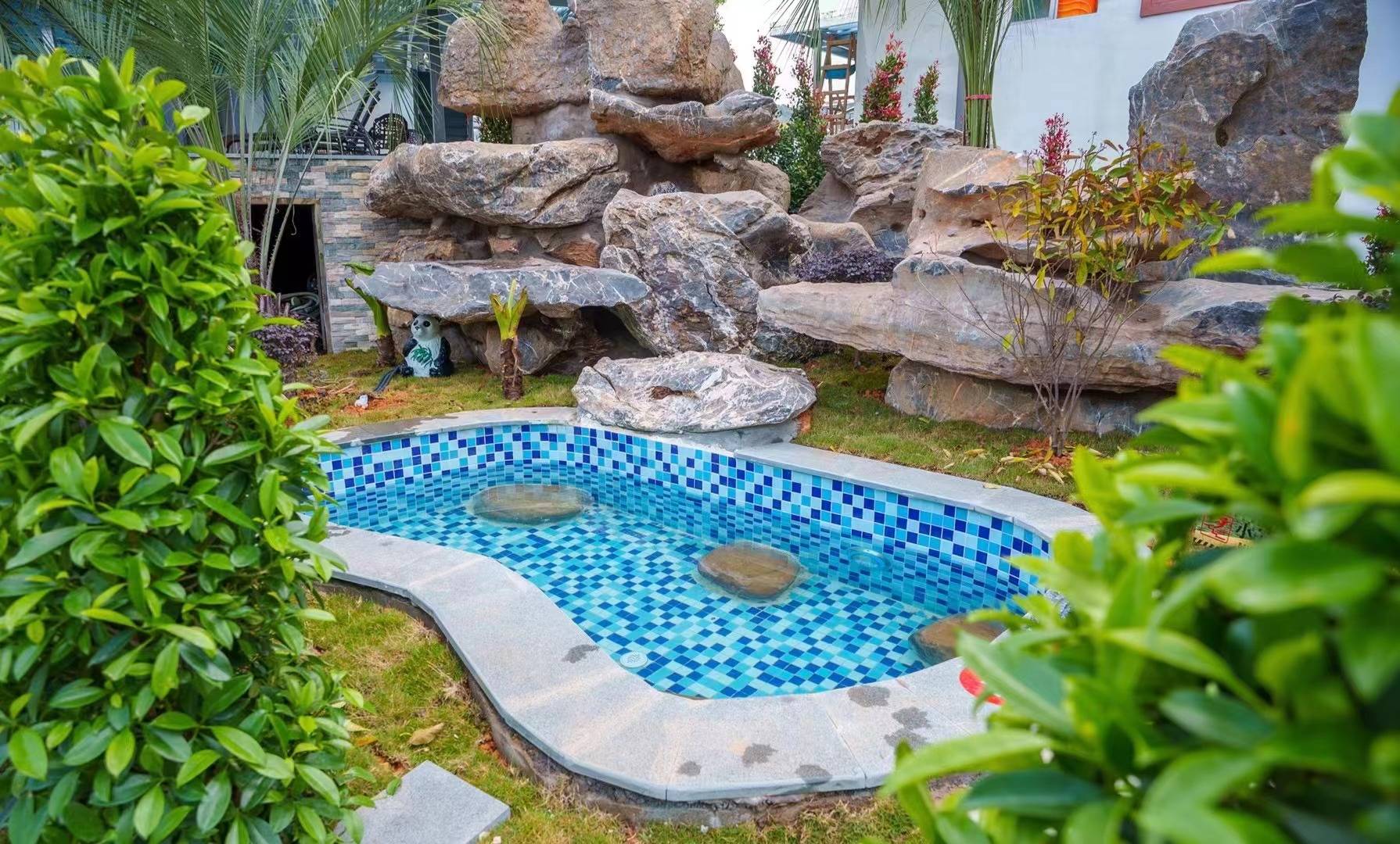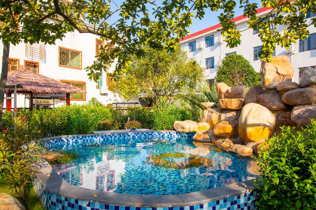 可以在室外的天然山水泳池,享受着被青山包围,绿水围绕,周围汇集了林、泉、石、等景观~