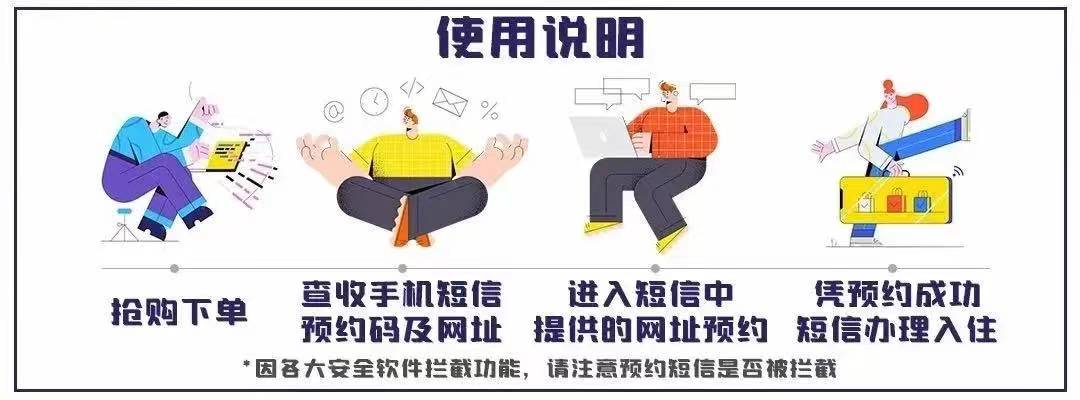 ③ 抢购流程:立即抢购--收到预约短信--通过预约短信预约日期以及补差(以收到的短信为准,收到即预约成功,预约成功不得退改)--办理入住