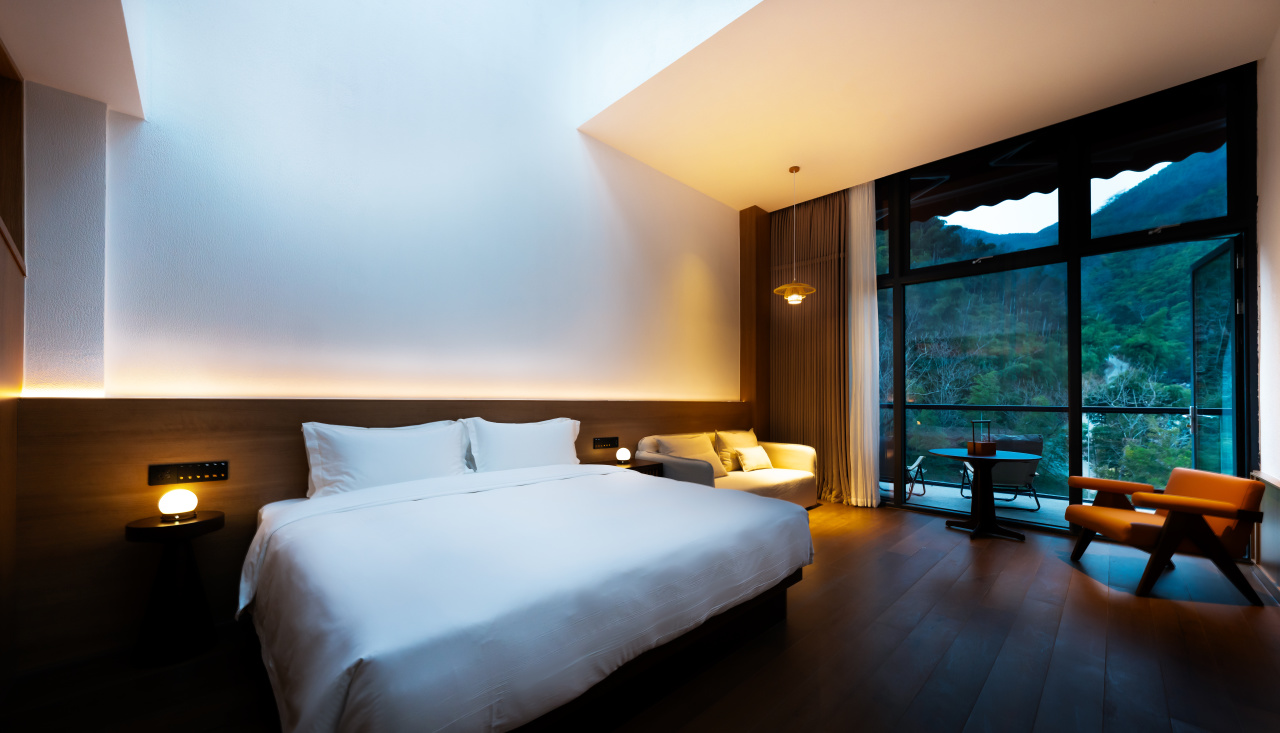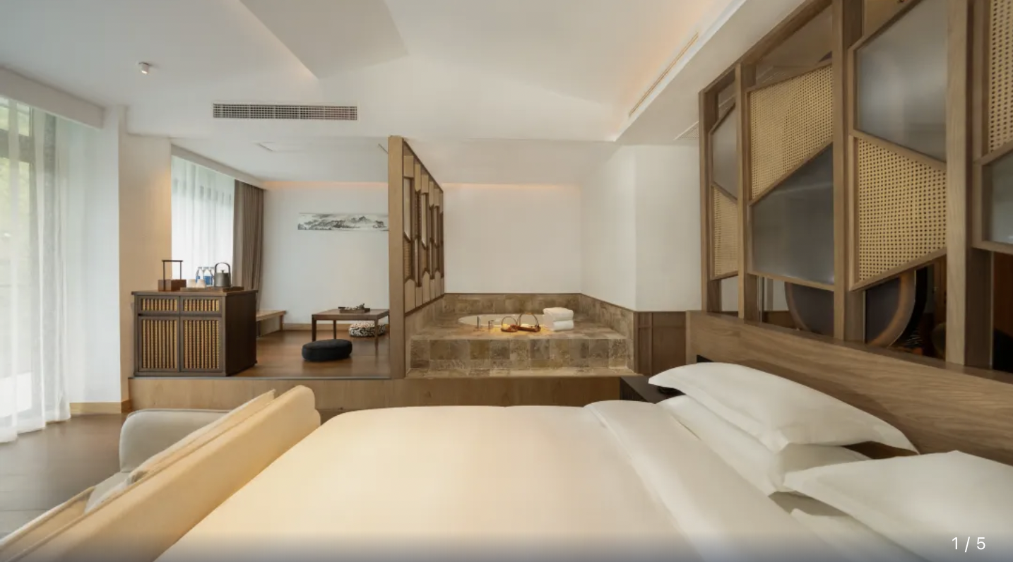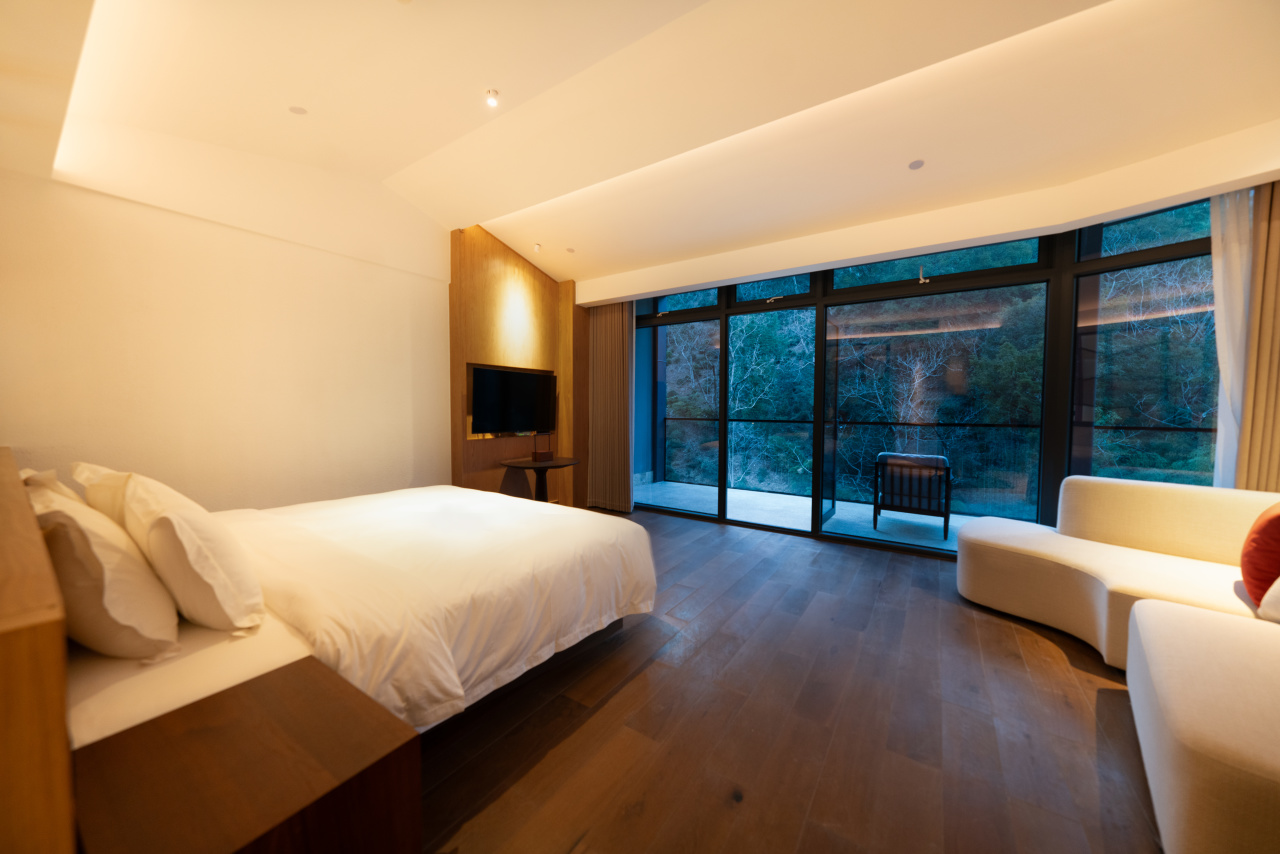 酒店拥有尊享双卧叠墅、悦享双卧套房、豪华星空汤屋、豪华溪谷汤屋、高级Loft庭院房等各类典雅客房103间(套)。巧筑于山峦竹林间转、峡谷大溪之畔,面积自50平米至200平米,其中2栋客房皆自带独立汤泉泡池,尽览山川、竹林和溪流美景。