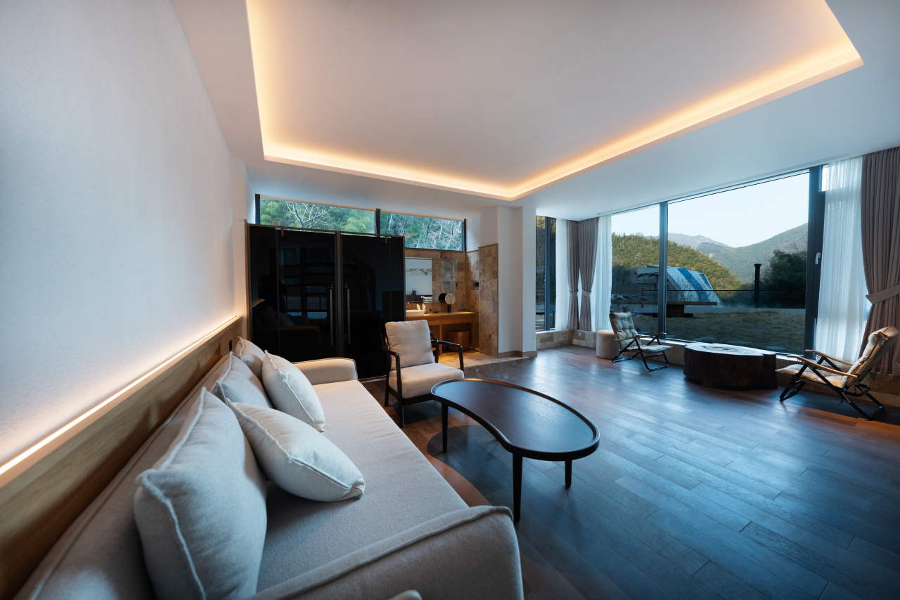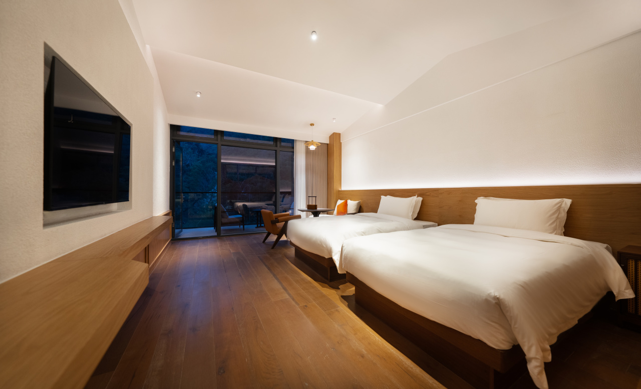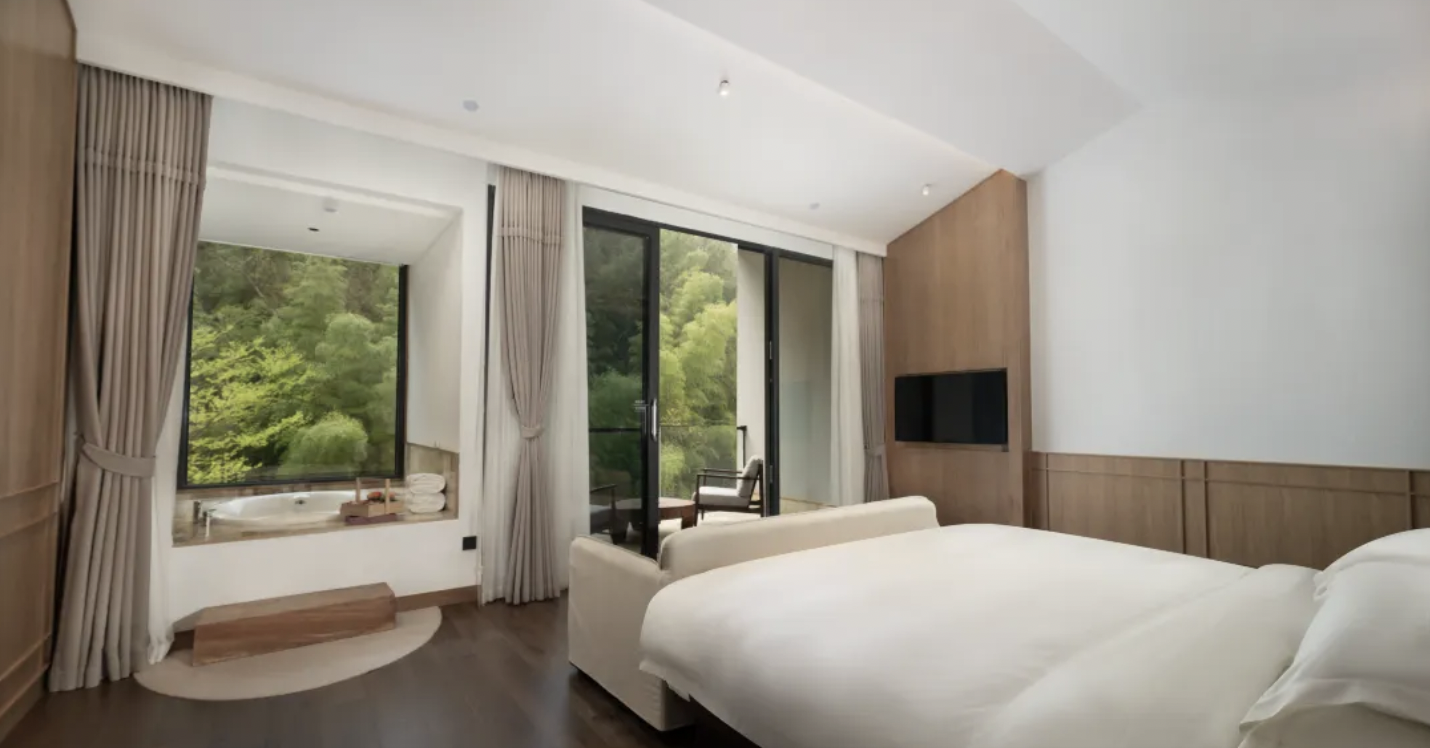 酒店拥有尊享双卧叠墅、悦享双卧套房、豪华星空汤屋、豪华溪谷汤屋、高级Loft庭院房等各类典雅客房103间(套)。巧筑于山峦竹林间转、峡谷大溪之畔,面积自50平米至200平米,其中2栋客房皆自带独立汤泉泡池,尽览山川、竹林和溪流美景。