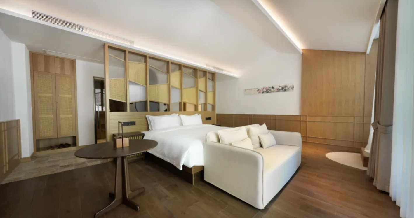 客房秉承现代简约的设计风格,以原木色为主调,亚麻织物、竹织藤蔓为配饰。山水之间,得一方诗画桃源,回归恬静生活。