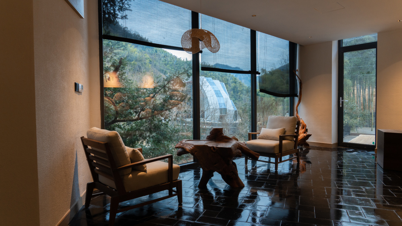 酒店在选址上更是妙不可言,酒店背靠天目山北麓,紧邻两山理念提出地余村,坐拥得天独厚的生态环境,拥有山、涧、竹、茶、汤泉等自然及人文资源。