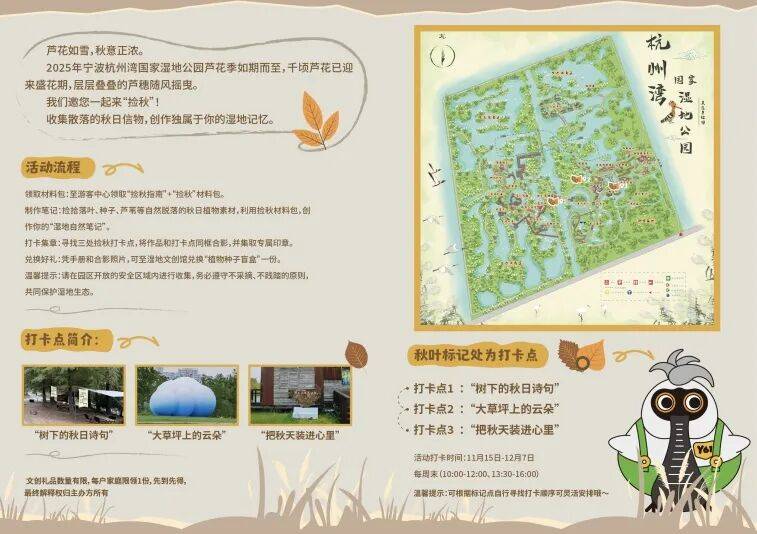 秋风起,芦花开,2025浙江杭州湾国家湿地公园芦花季正式官宣上线。11月15日起至12月7日,每周末10:00-12:00、13:30-16:00,大家可前往游客服务中心免费领取《捡秋指南》+材料制作包一份(数量有限),内含路线地图、打卡指南,快来创作出独属于你的秋日湿地自然笔记。(具体可看宁波杭州湾湿地公园公众号)